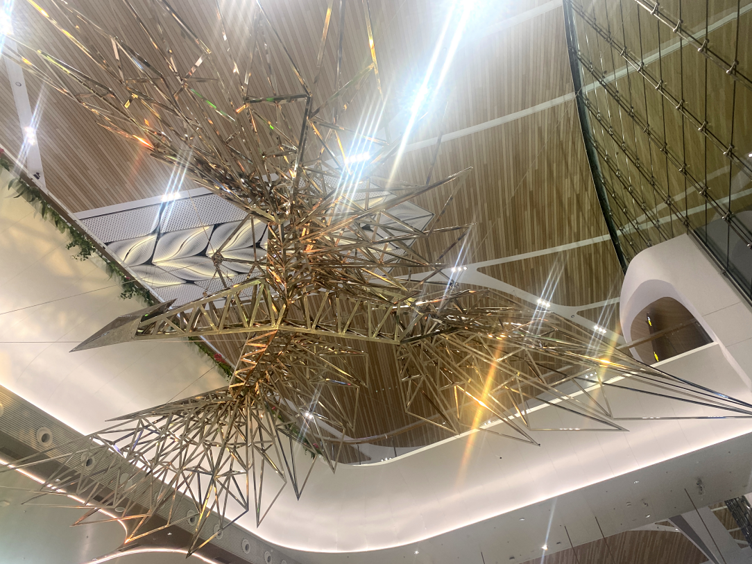 “栖云”以“岭南神鸟”为核心创意——艺术家将广东省鸟白鹇融入设计,为往来旅客打造了一场充满诗意的“接风洗尘”仪式。作品由两只形态互补的“神鸟”构成:一只身姿舒展,如岭南山水般写意流畅;一只轮廓利落,似机场钢结构般现代简约,巧妙实现了自然灵韵与工业美学的梦幻联动。值得一提的是,这对重达数吨的“大鸟”暗藏“黑科技”:通过隐藏式受力设计实现悬浮效果,镜面材质的羽翼实时倒映航站楼内的流动人影与光影;智能光线系统更能随旅客脚步变换色调,营造出灵动多变的视觉体验。它们盘旋云端的姿态,仿佛在轻声问候每一位旅人“一路辛苦啦,欢迎来到广州!”,让岭南之旅从抬头的第一眼便充满优雅与温暖。